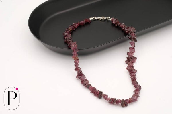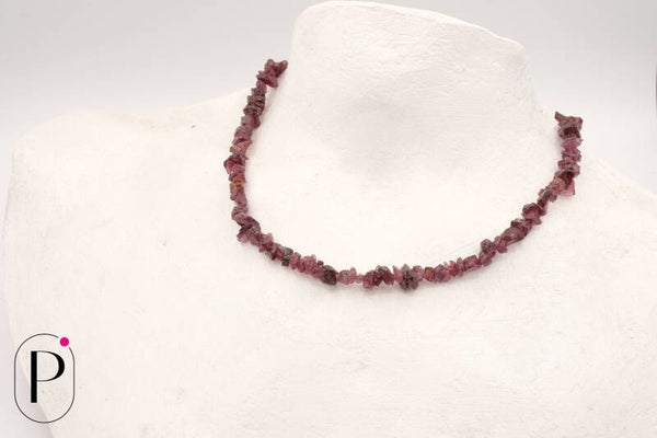 Halsketting van met kleine Granaat-parels in een ruwe vorm. Een fijne en eenvoudige ketting met een mooie rode kleur.