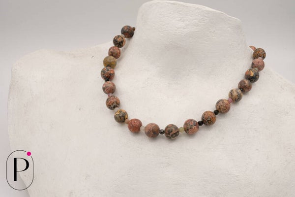 Bruine Jaspis kralen met daartussen fijne Toermalijn facet parels.