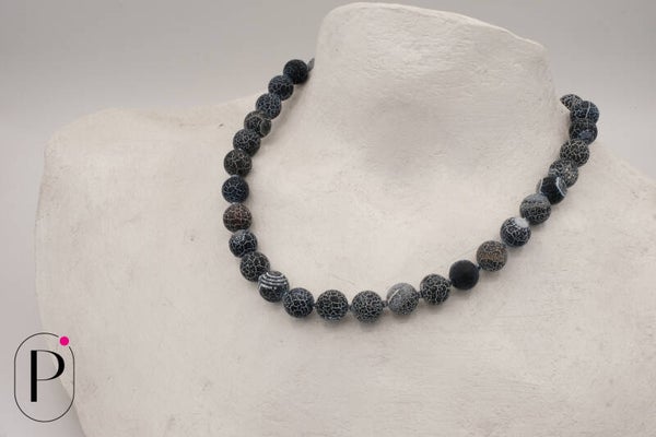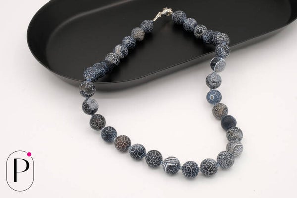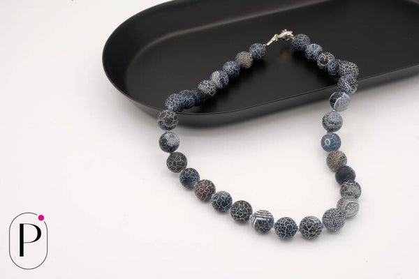 Blauw-witte Agaat parels met een cracklé effect. Hiertussen zitten fijne Swarowski-kraaltjes. De halsketting is afgewerkt met een sterling zilver karabijnslot.