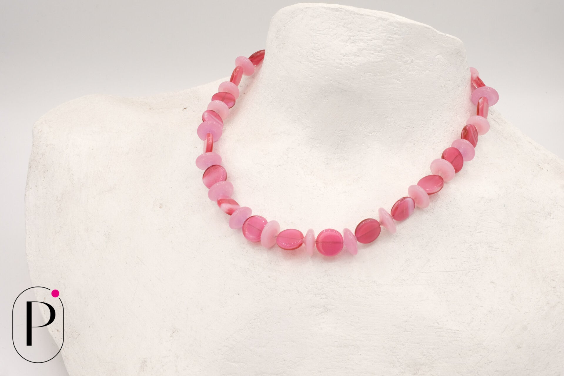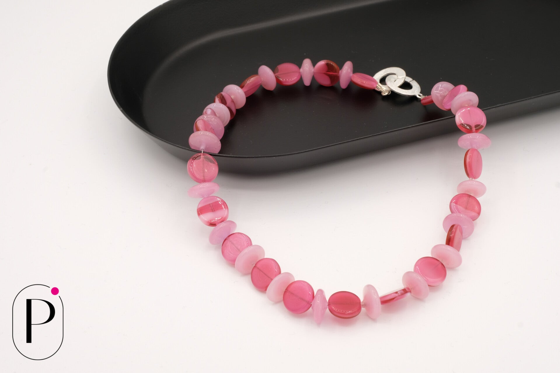 Halsketting metdonker en lichtroze glaskralen. Het slot is een Sterling zilver handboeislot.