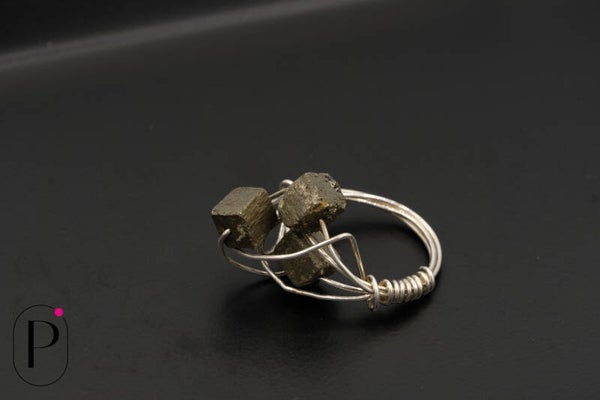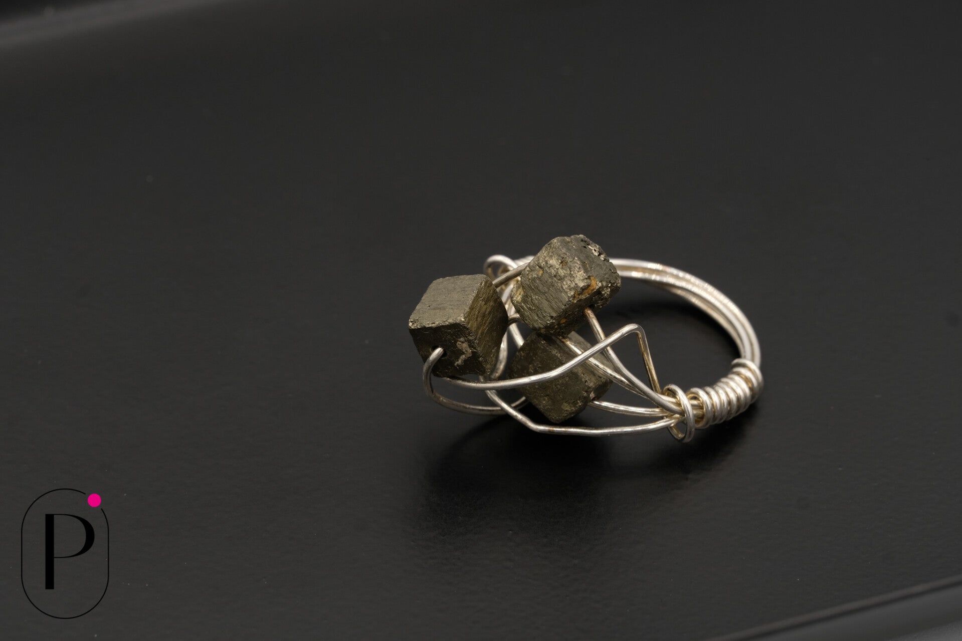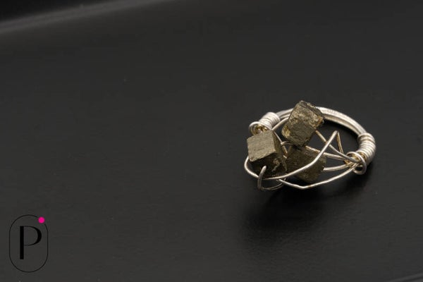 Ring gevormd uit zilverdraad met daarin 3 Pyriet-steken verwerkt.