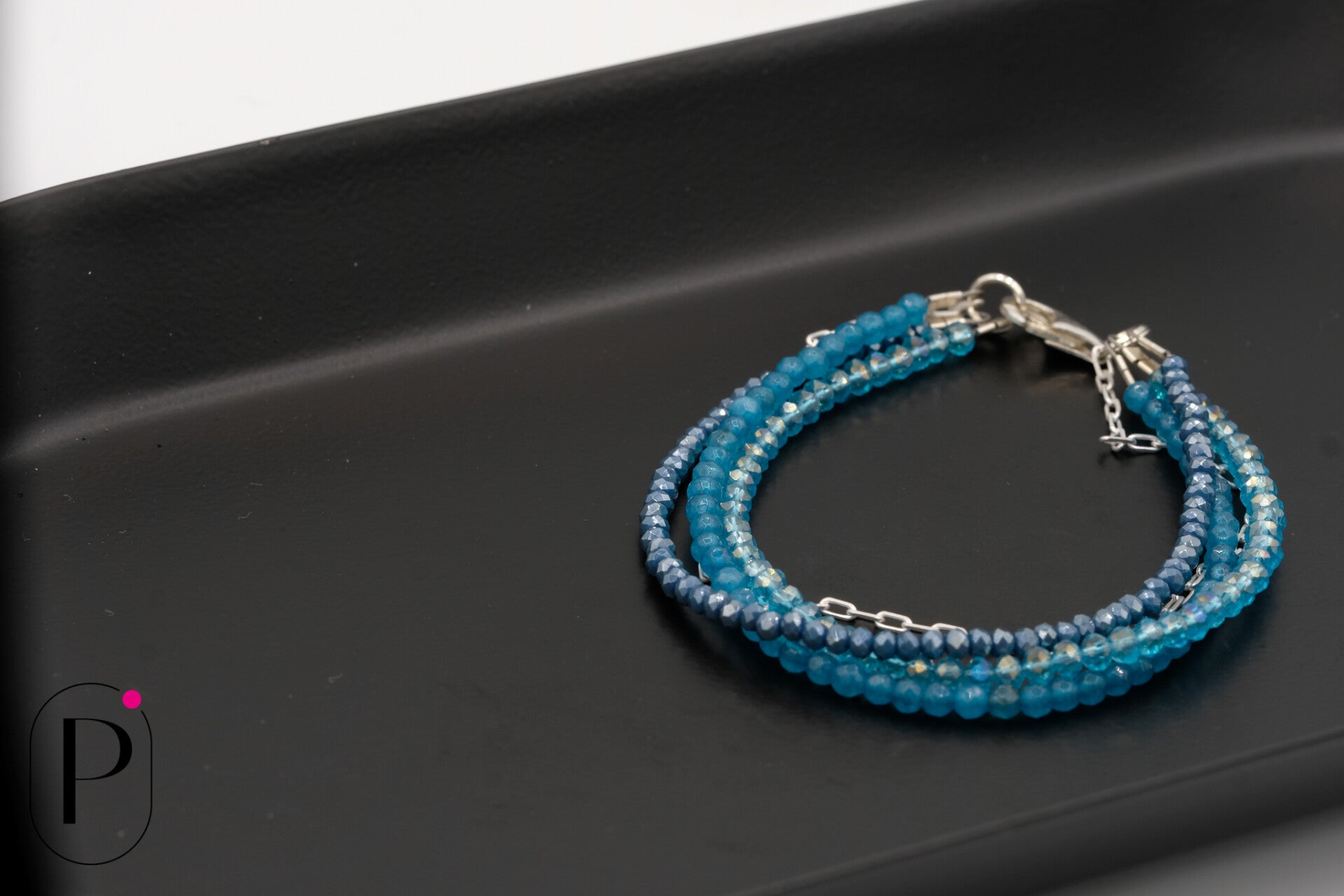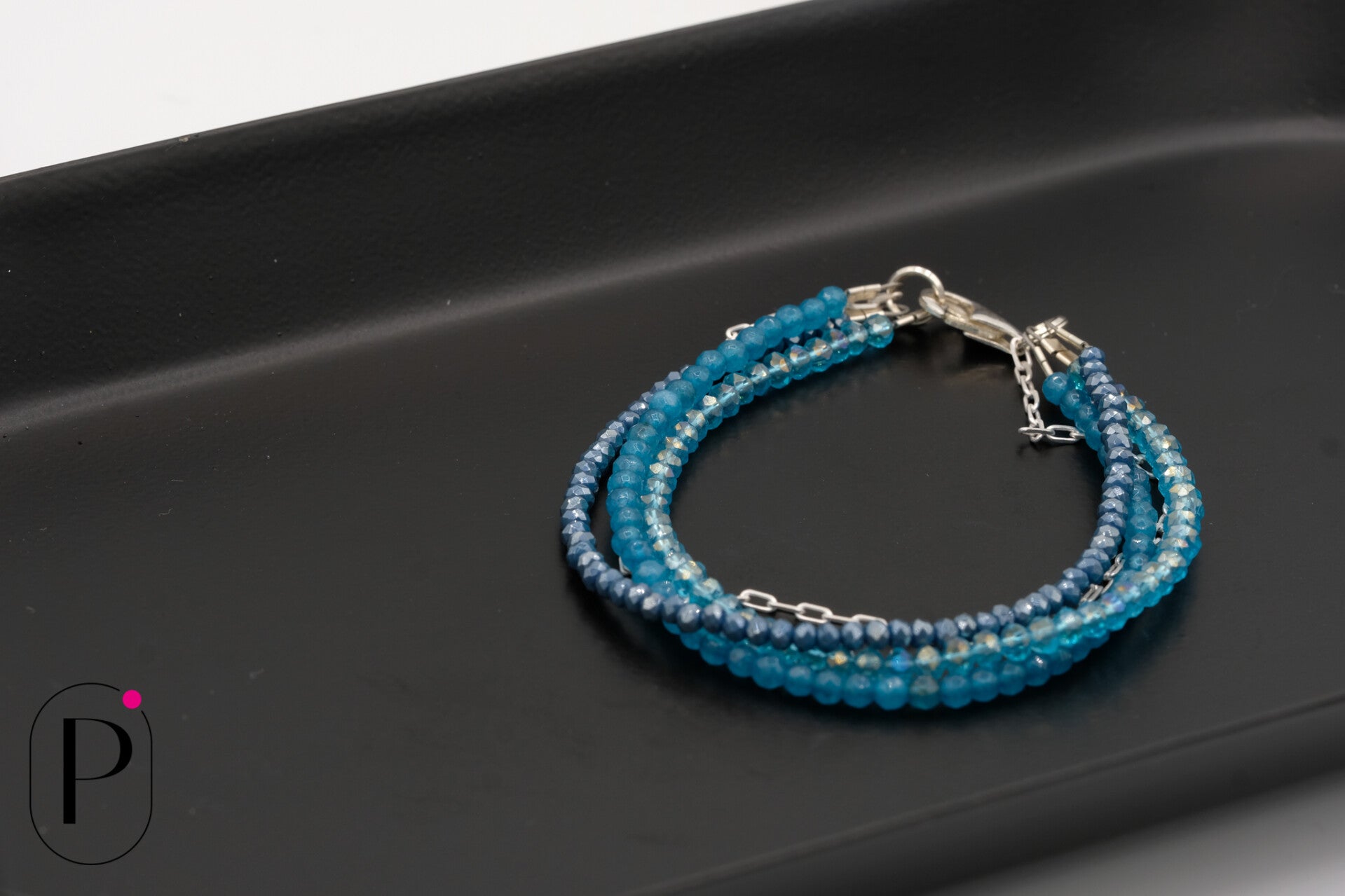 Armband met zilveren schakelketting en groen-blauwe facet-parels: glaskralen en Swarowski's. Afgewerkt met een sterling zilver karabijnslotje.