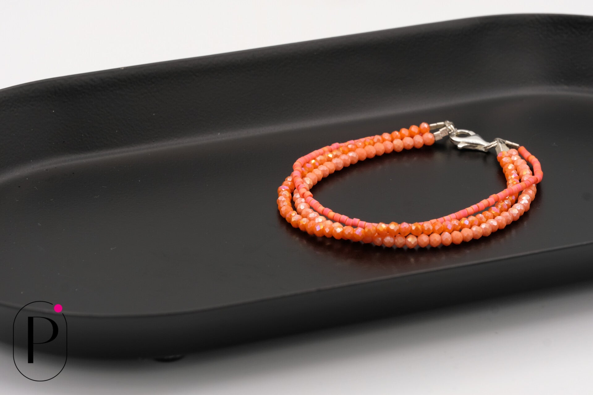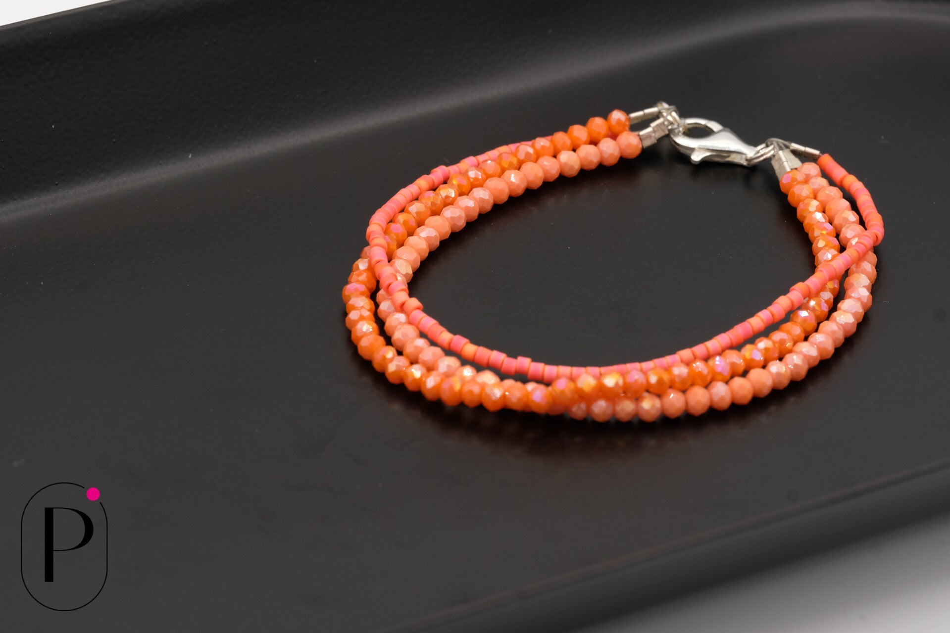 Armband met prachtig fel oranje parels. Twee rijtjes glaskralen en één rijtje Miyuki-kralen. Afgewerkt met sterling zilver.