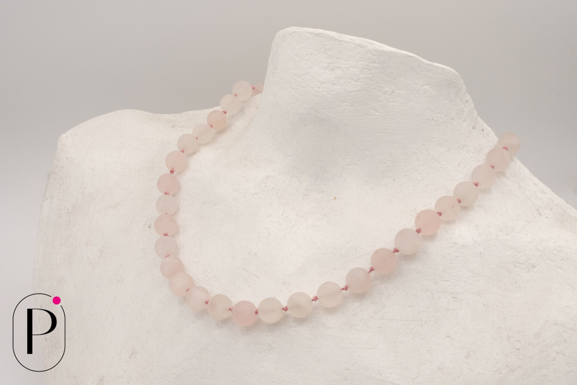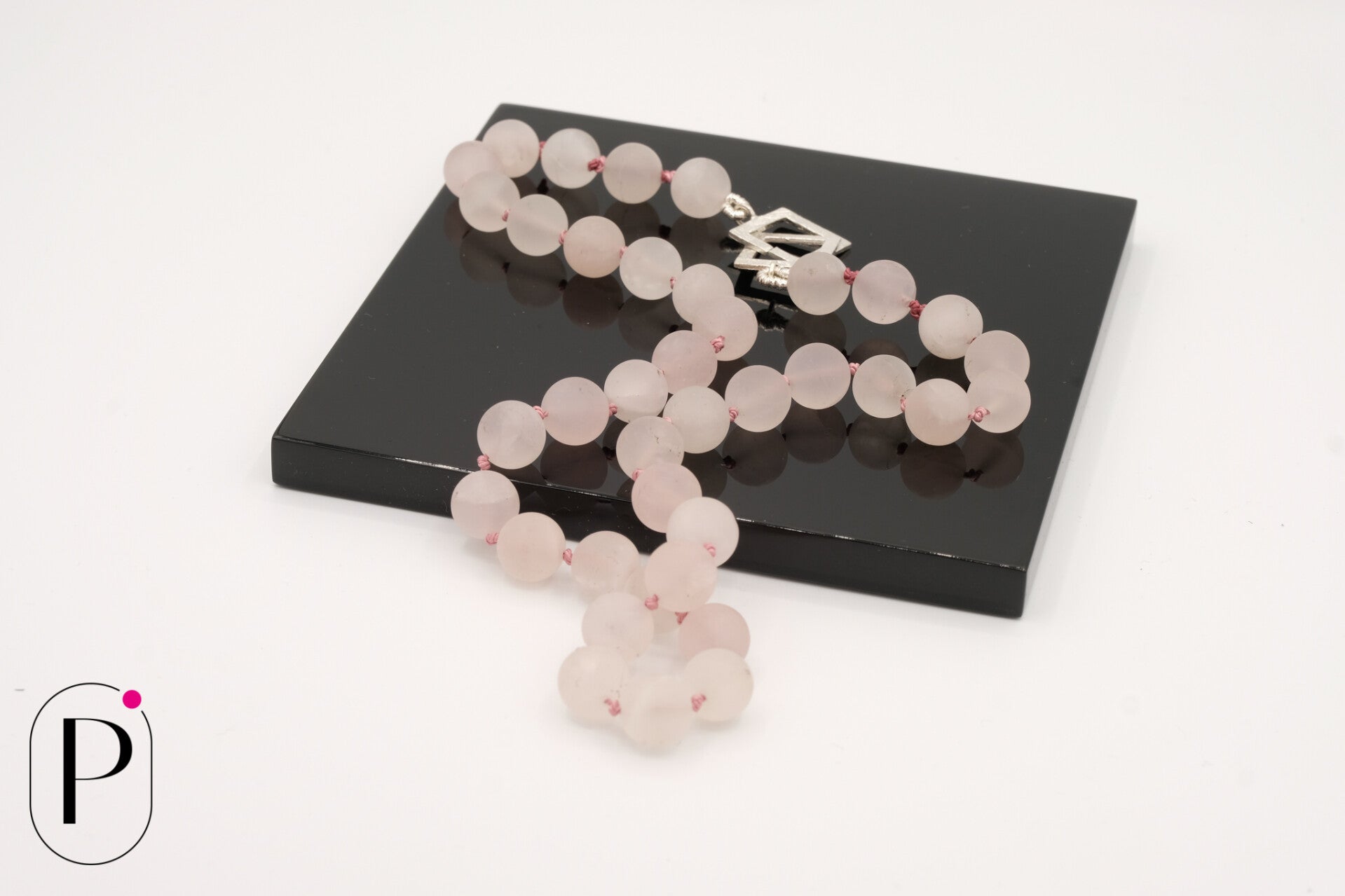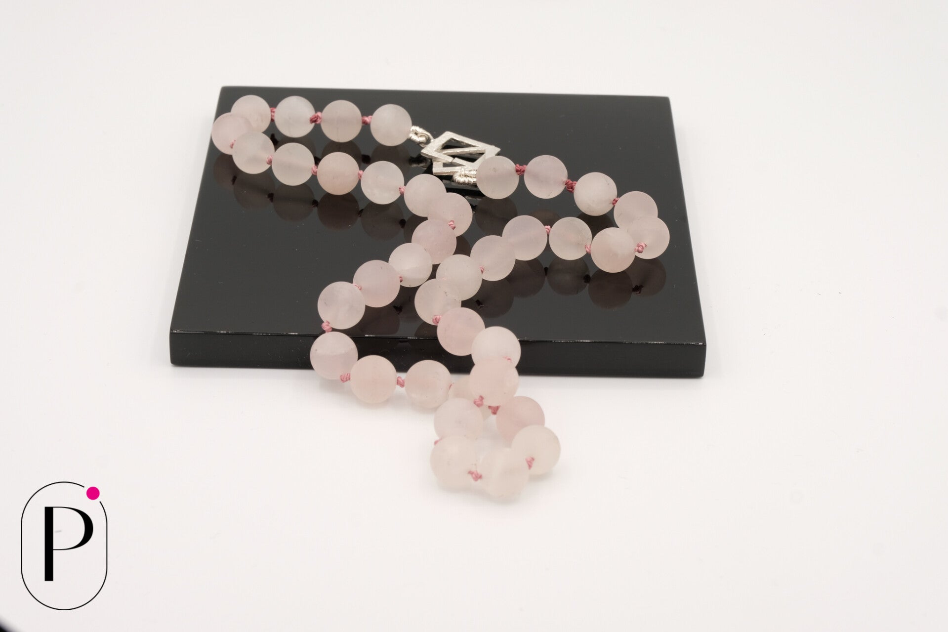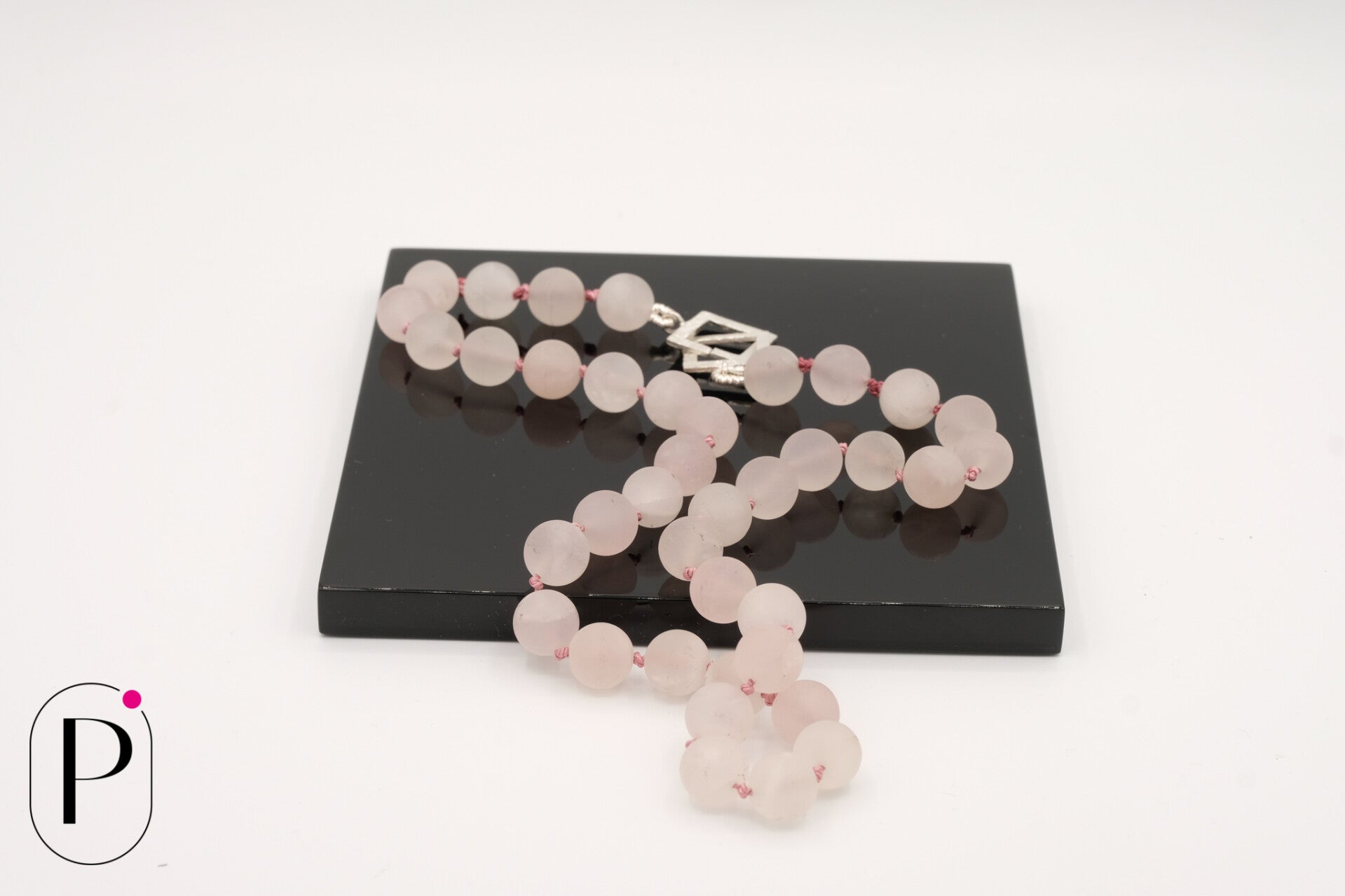 Halsketting met matte Rozenkwarts parels. Deze ketting is handgeknoopt met bijpassende roze knoopdraad. De ketting is afgewerkt met een origineel sterling zilveren slot.