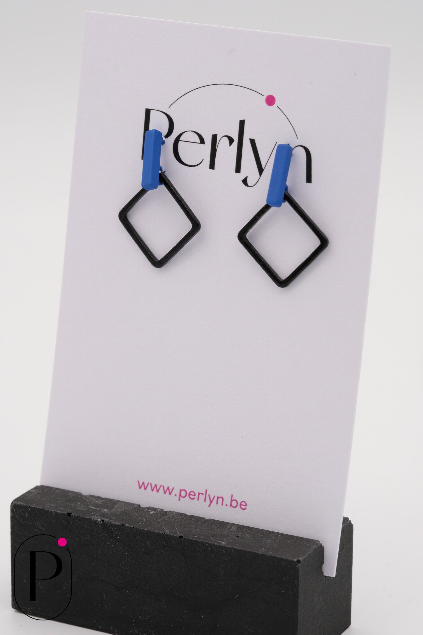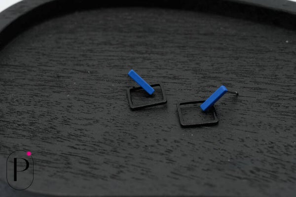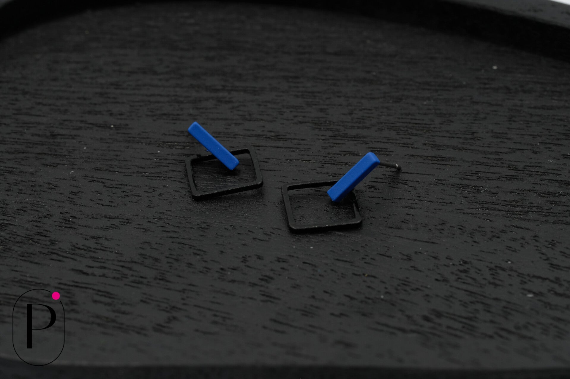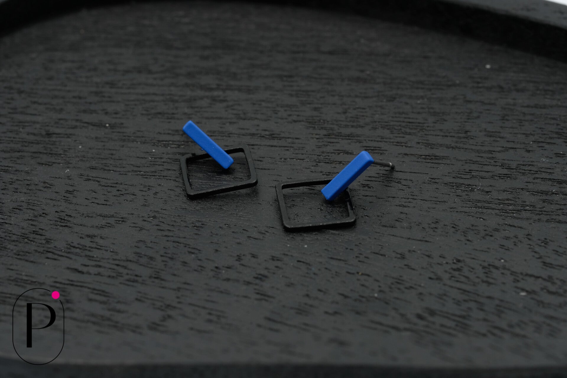 Fijne berubberde recthoekige hemelsblauwe oorstekers met daaraan zwarte metalen vierkantjes.