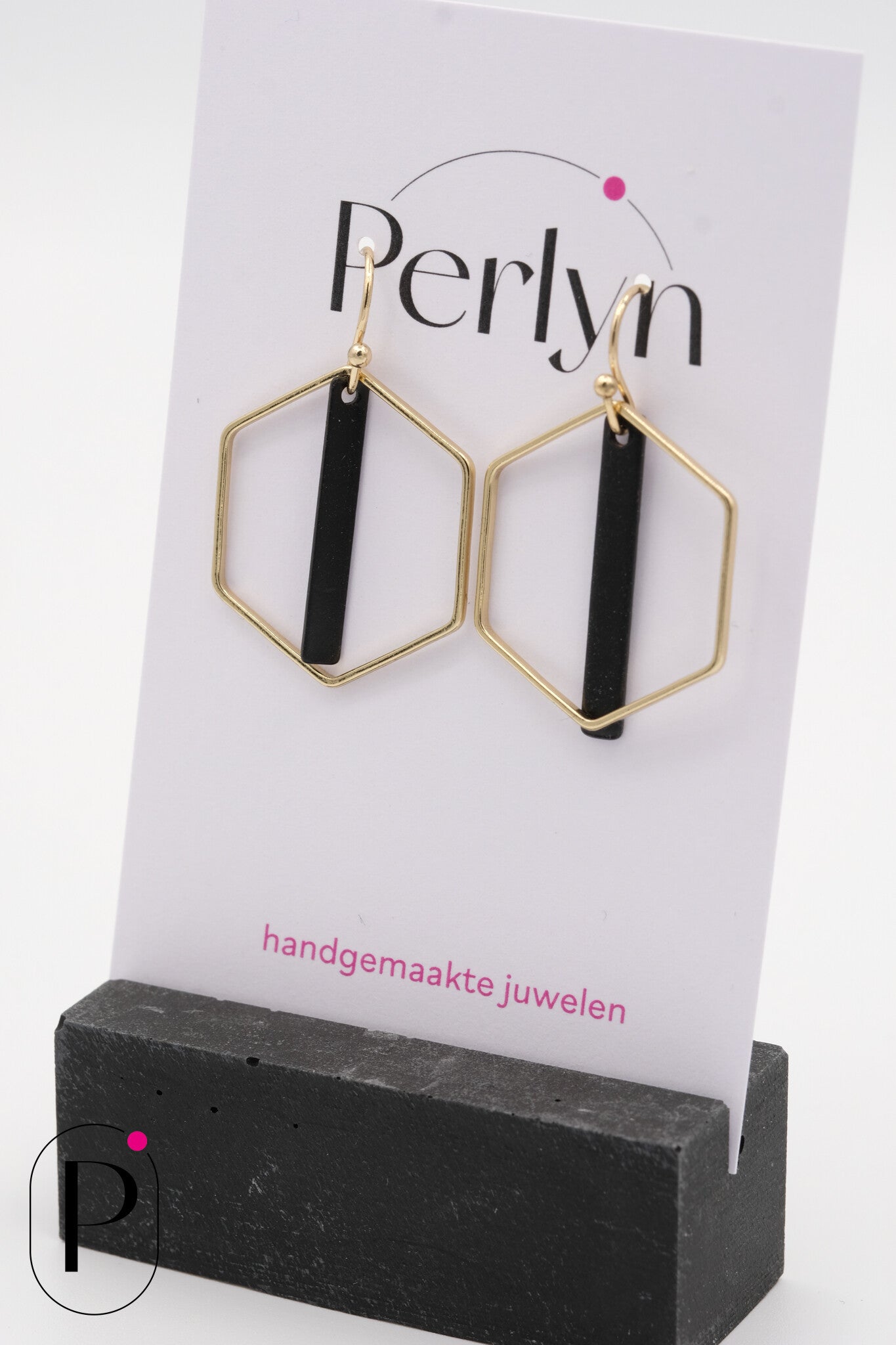 Eenvoudige gouden oorhaakjes met gouden zeshoeken en zwarte smalle staafjes.