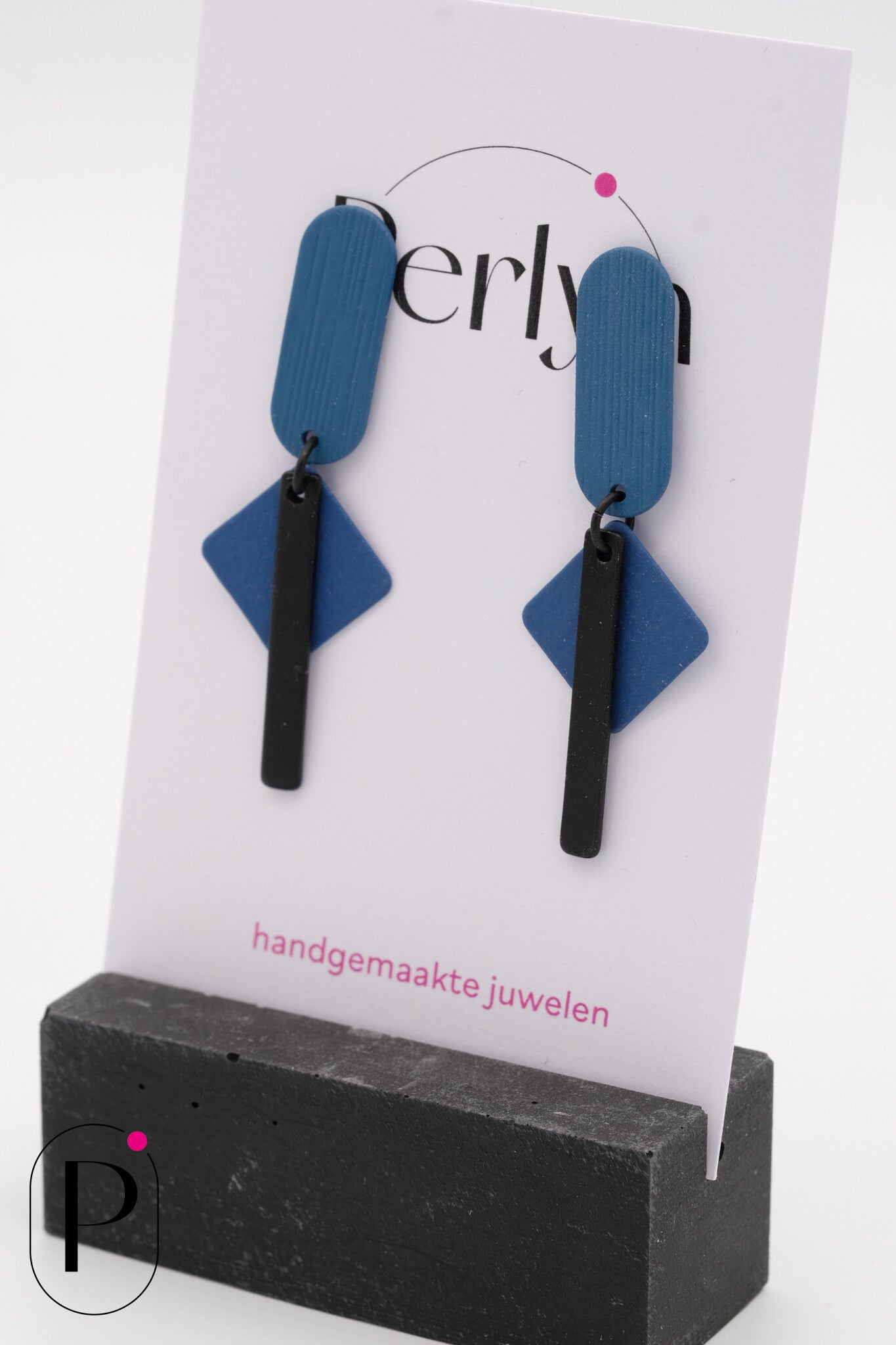 Oorstekers en volle vierkantjes in berubberd kongsblauw. Afgewerkt met mat zwarte smalle staafjes in metaal.