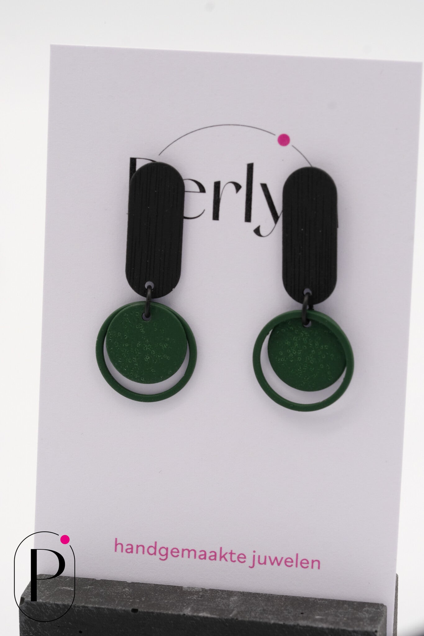Mat zwarte oorstekers afgewerkt met bedels in berubberd donkergroen. Alle materialen zijn van metaal, uiteraard anti-allergisch.