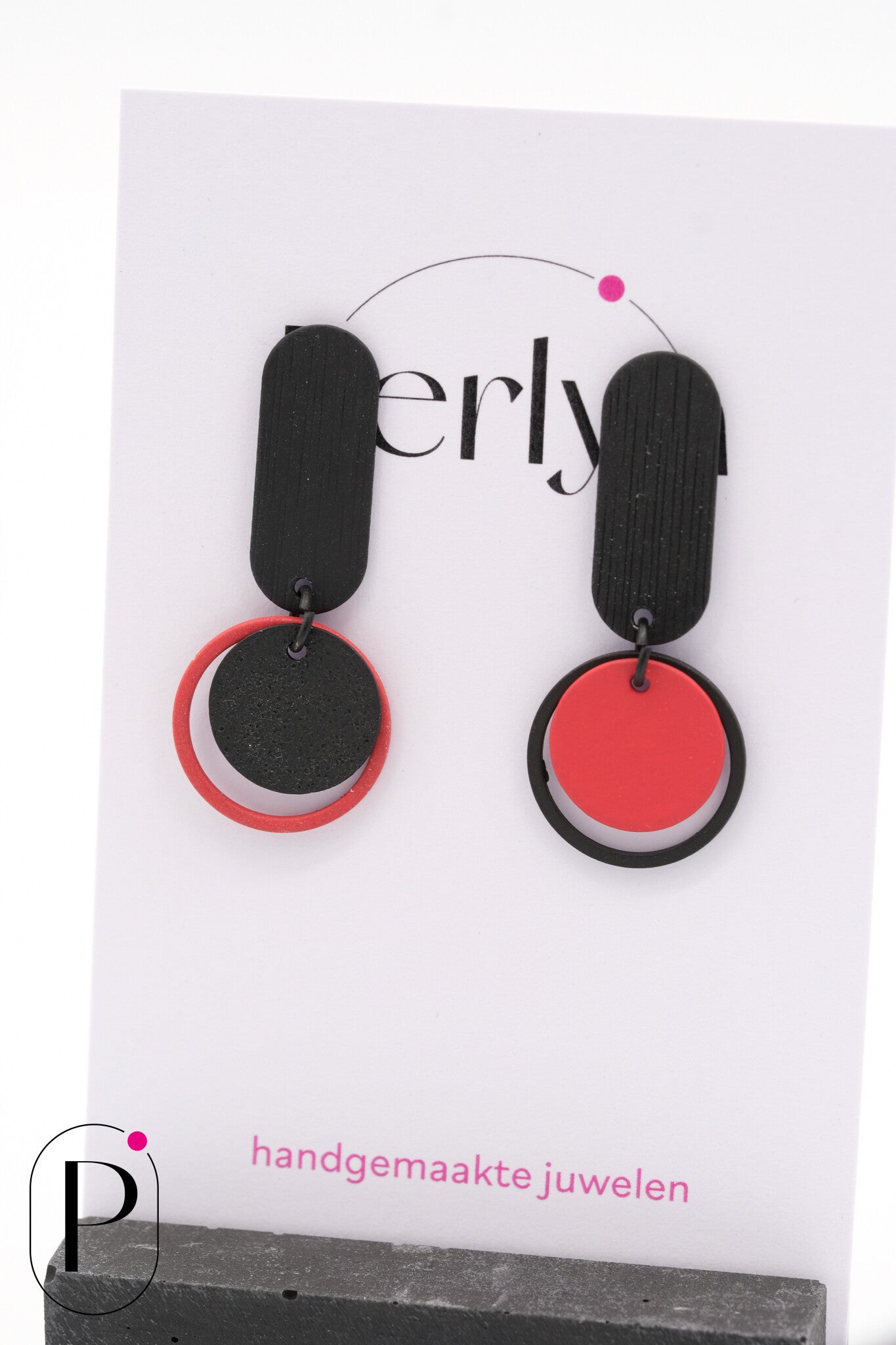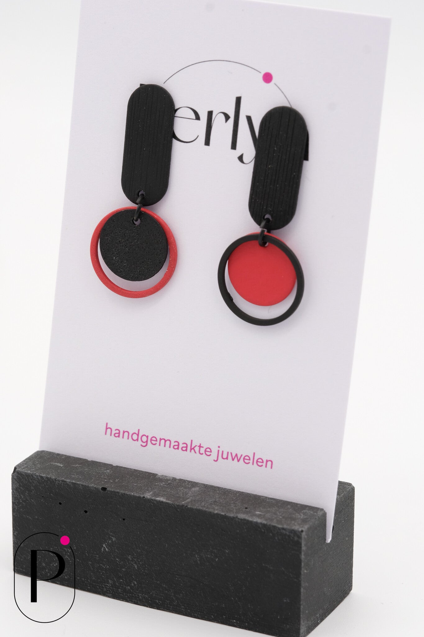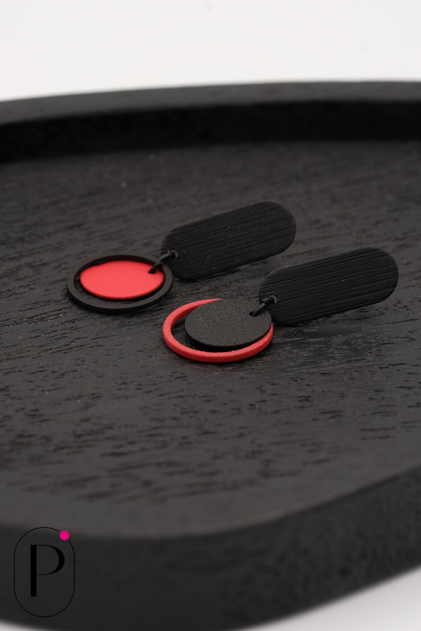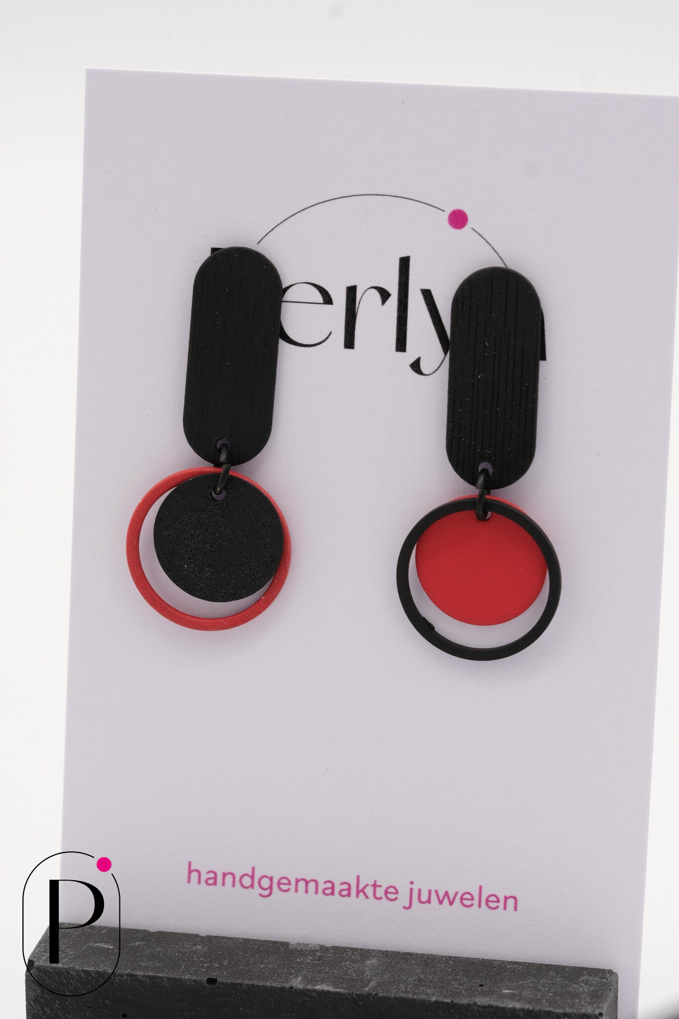 Assymetrische mat zwarte oorstekers afgewerkt met bedels in mat zwart en berubberd rood. Alle materialen zijn van metaal, uiteraard anti-allergisch.