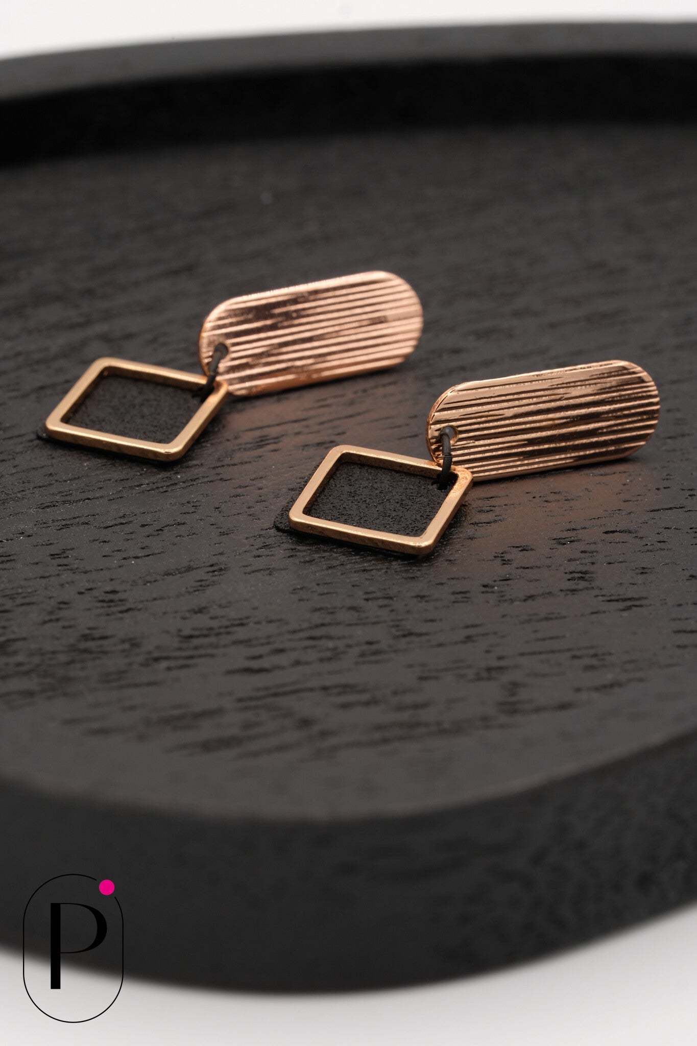 Gouden oorstekers met zwarte volle vierkantjes en gouden vierkantjes. Alle materialen zijn van metaal, uiteraard anti-allergisch.