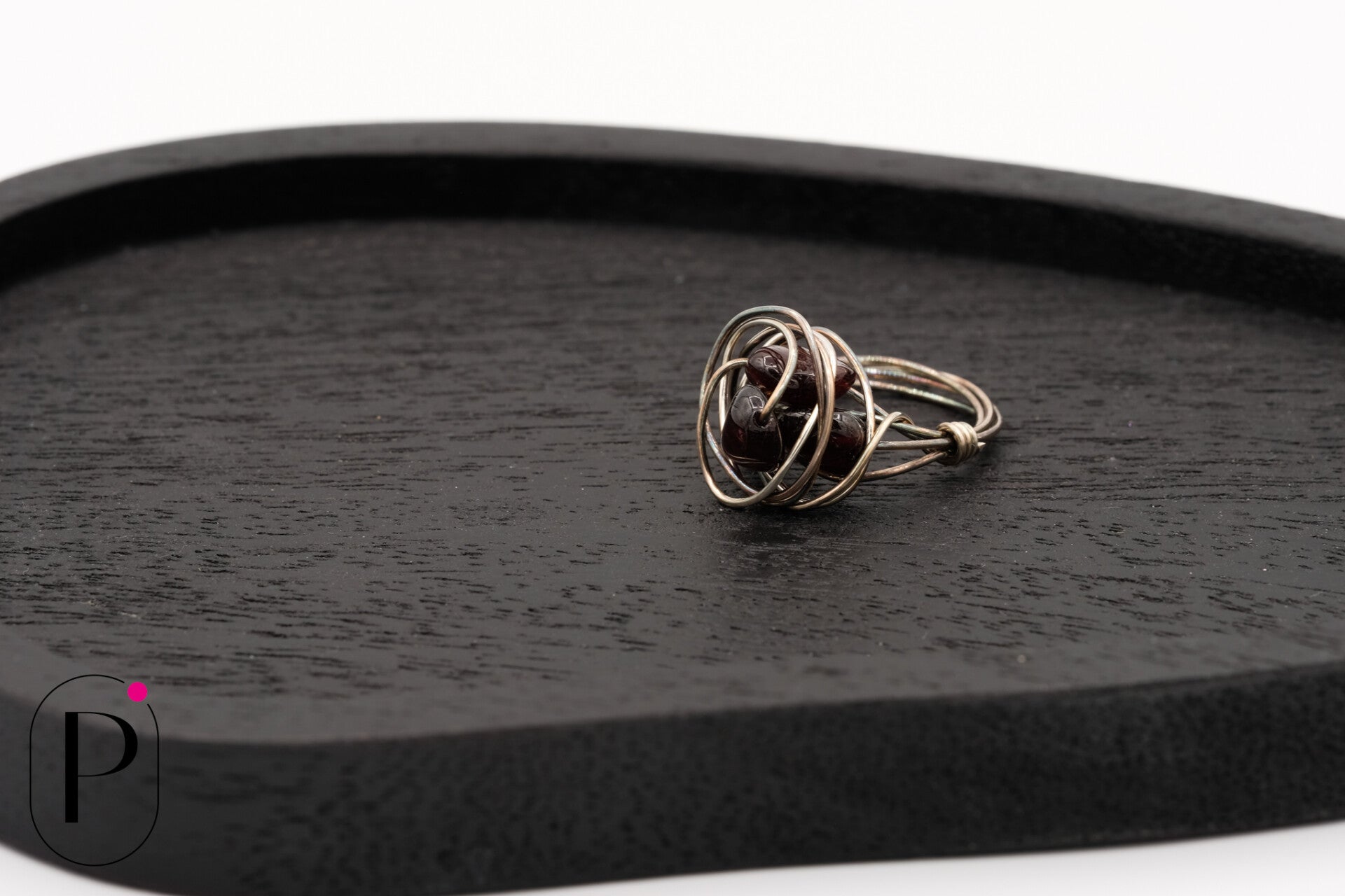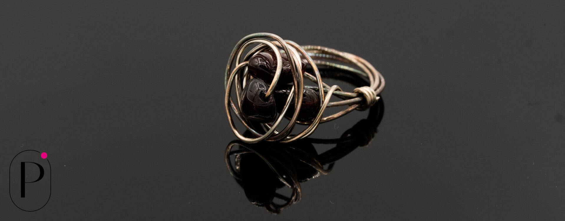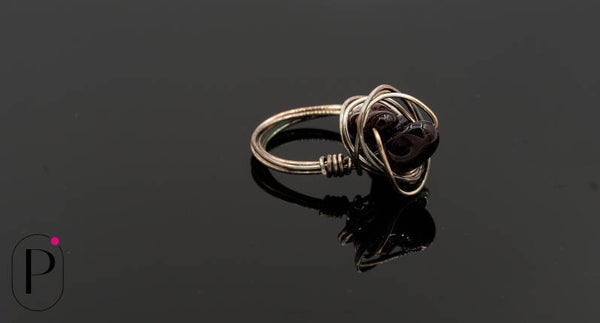 Handgemaakte ring van zilverdraad met daarin 3 edelstenen Granaat in verwerkt.