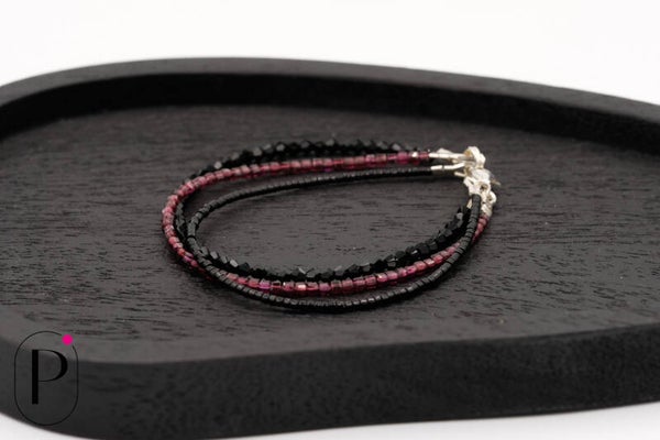 Fijn armbandje met zwarte Miyuki's en toupie Swarowski's en vierkante Granaat-pareltjes.