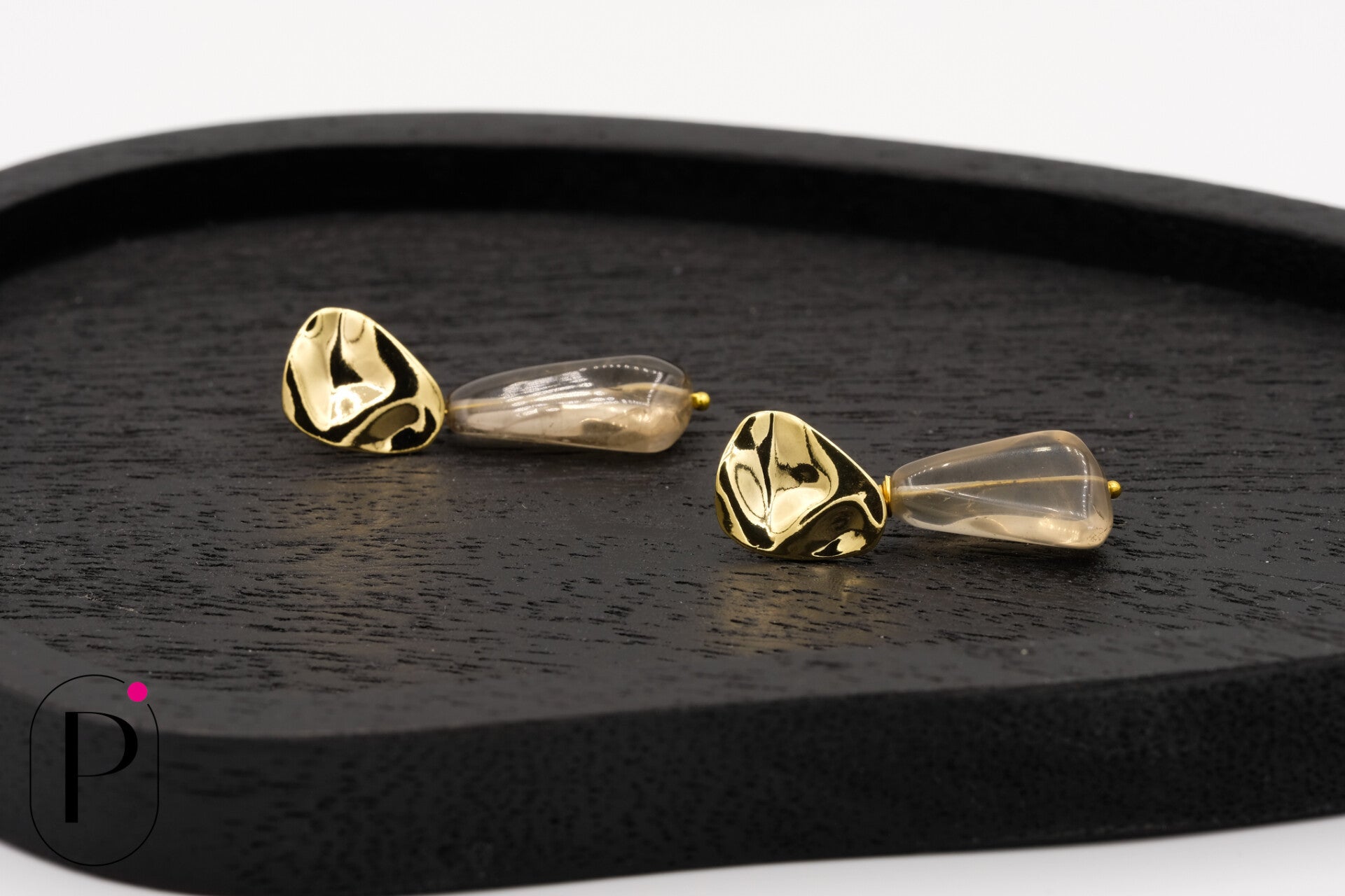 Goudkleurige oneffen oorsekers (18K long lasting plated). Hieraan hangen handgesplen Smoky Quartz parels. Omdat ze handgeslepen zijn, zijn deze parels niet identiek maar dat geeft deze oorbellen net dat beetje extra.
