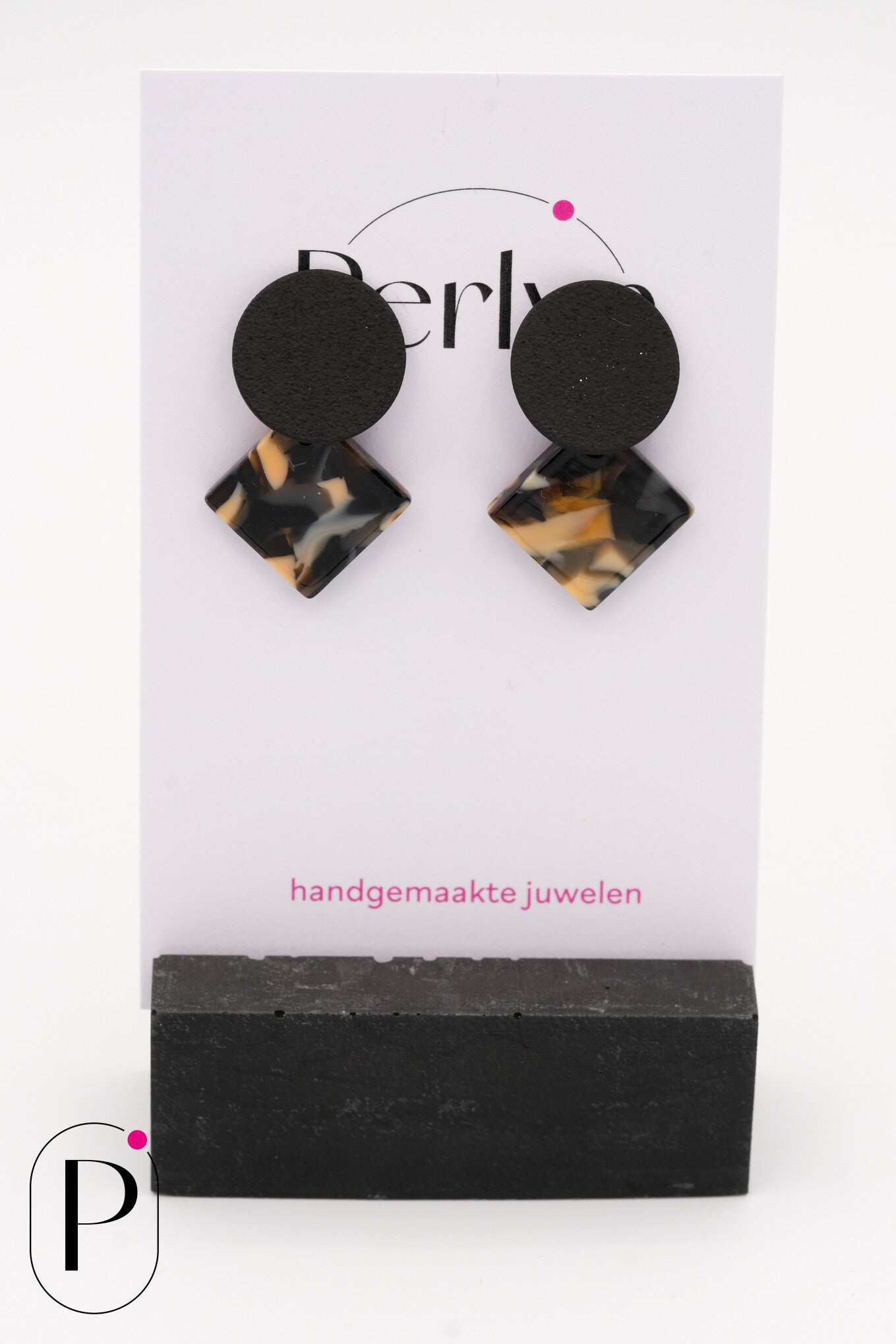 Zwarte korrelige oorstekers met daaraan vierkante bedels in resin.