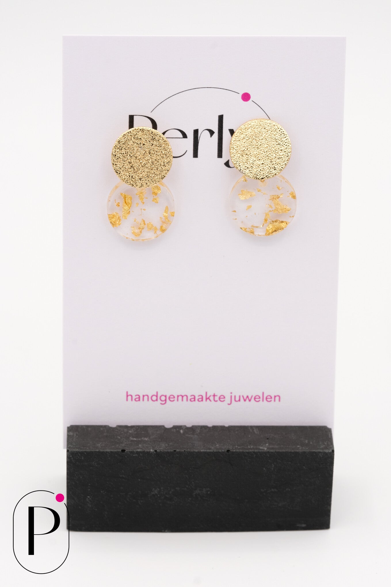 Goudkleurige korregelige oorstekers met daaraan doorzichtig gouden bedels in resin.