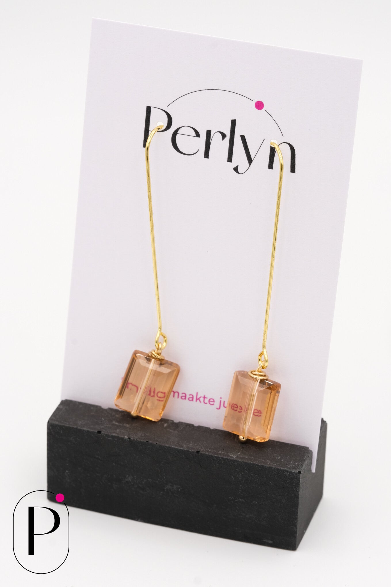 Goudkleurige hoorhaken afgewerkt met vierkante perzikkleurige facet geslepen glaskralen.